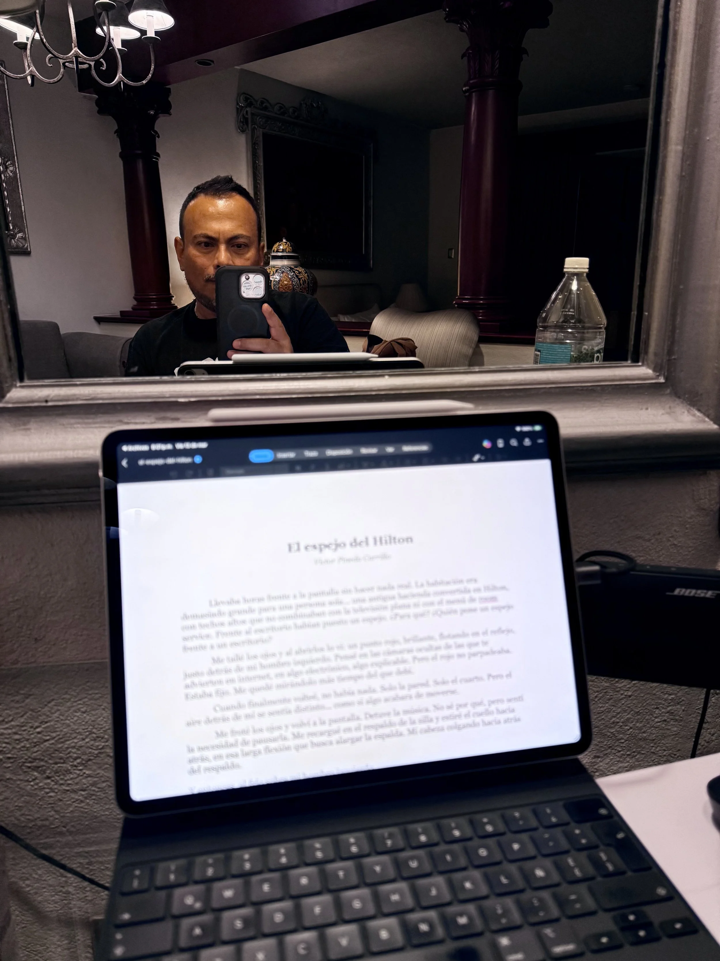 Llevaba horas frente a la pantalla sin hacer nada real. La habitación era demasiado grande para una persona sola... una antigua hacienda convertida en Hilton, con techos altos que no combinaban con la televisión plana ni con el menú de room service. Frente al escritorio habían puesto un espejo. ¿Para qué? ¿Quién pone un espejo frente a un escritorio?